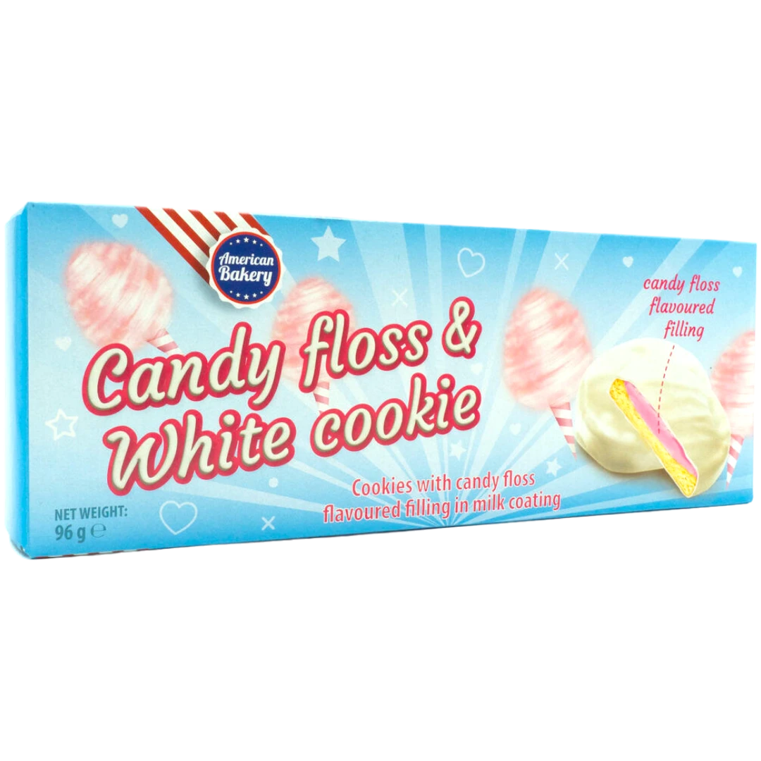 Delicious white chocolate coated cookies with a velvety, pink candy floss flavoured filling.