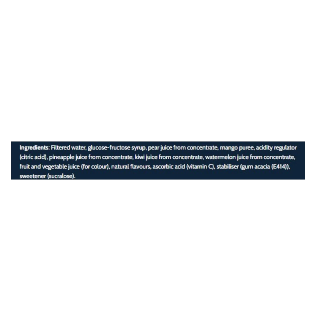 Premium Brewed Blend Of Green Tea Using Filtered Water, High Fructose Corn Syrup (Glucose-Fructose Syrup), Pear Juice From Concentrate, Mango Puree, Citric Acid, Natural Flavors, Honey, Fruit And Vegetable Juice For Color, Caffeine, Ascorbic Acid (Vitamin C), Kiwi Juice From Concentrate, Vitamin E Acetate, Pineapple Juice From Concentrate, Guarana Root Extract, Watermelon Juice From Concentrate, Sucralose, Vitamin A Palmitate, Panax Ginseng Extract, Eleuthero Root Extract, Lemon Juice From Concentrate, Schisandra Extract.
