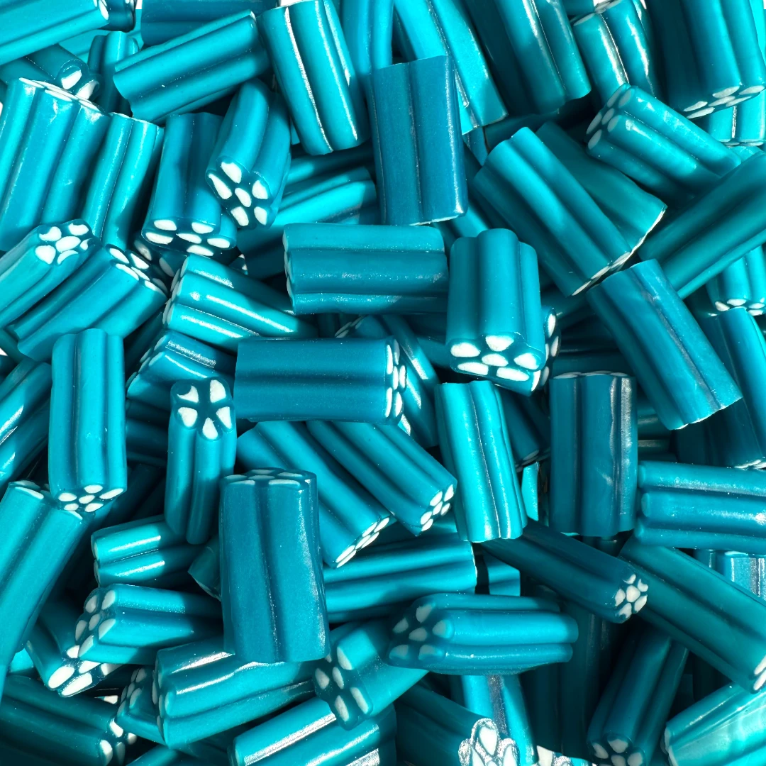 Our delicious blue raspberry revolvers are revolver-barrel-shaped blue raspberry flavoured sweet liquorice filled with ‘bullets’ of creamy fondant!