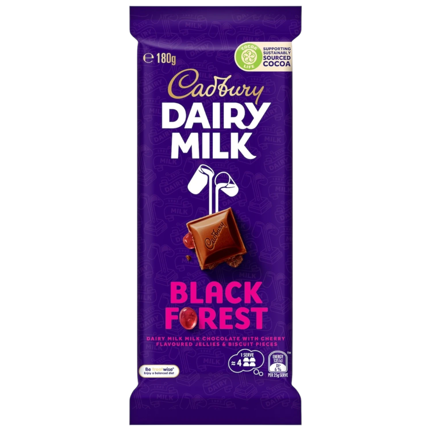 Indulge in Cadbury Dairy Milk Black Forest – a delicious Australian treat with cherry jellies and biscuit pieces in smooth milk chocolate. A thrilling and indulgent chocolate journey!