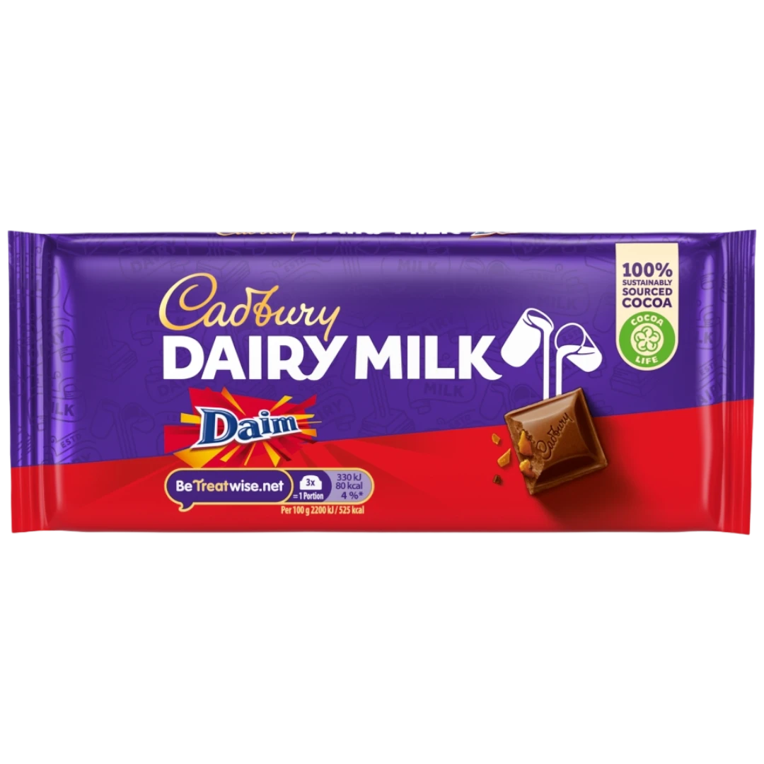 The Cadbury Dairy Milk Daim Chocolate Bar is made from deliciously creamy Cadbury Dairy Milk chocolate and scattered with golden chunks of Daim. Snap off a piece for irresistible crunchiness and smoothness in every bite!