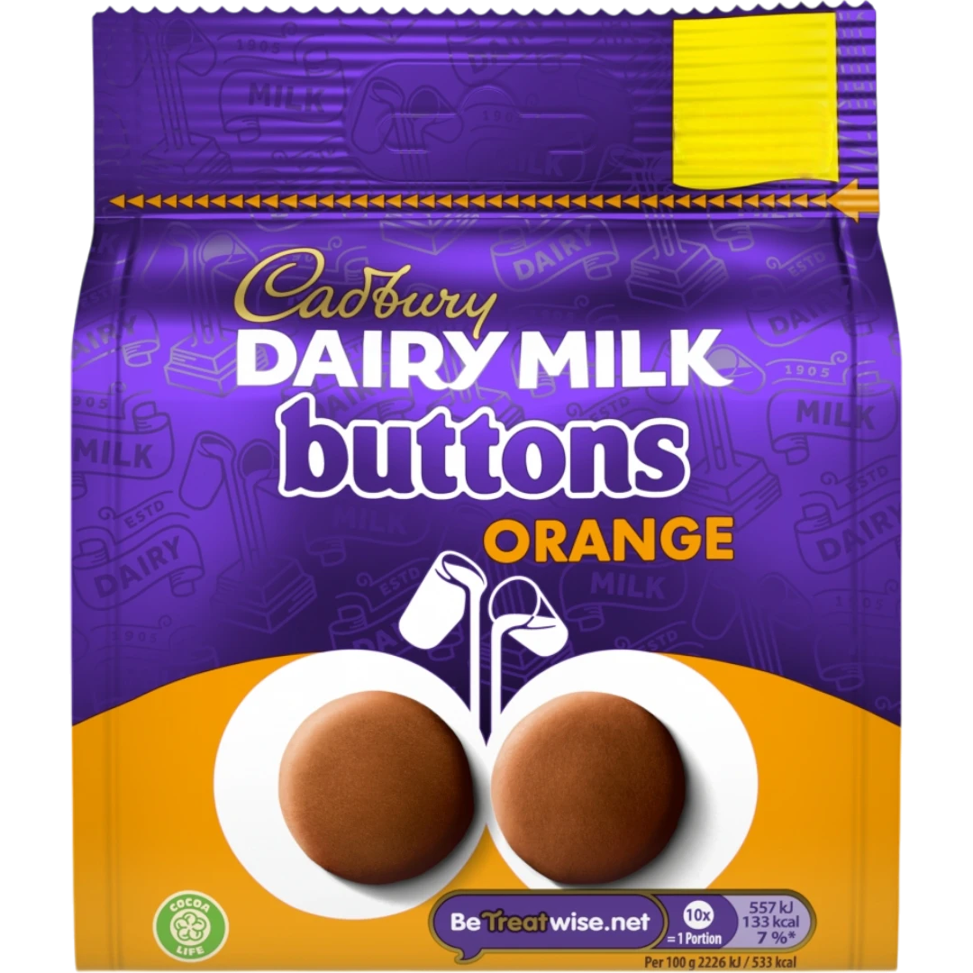 The classic creamy taste of Cadbury Dairy Milk with an orange twist. Button-shaped orange chocolate bites that have become a new favourite for the whole family to share. Made with sustainably sourced cocoa and suitable for vegetarians, the whole family can enjoy sharing these 85g bags.