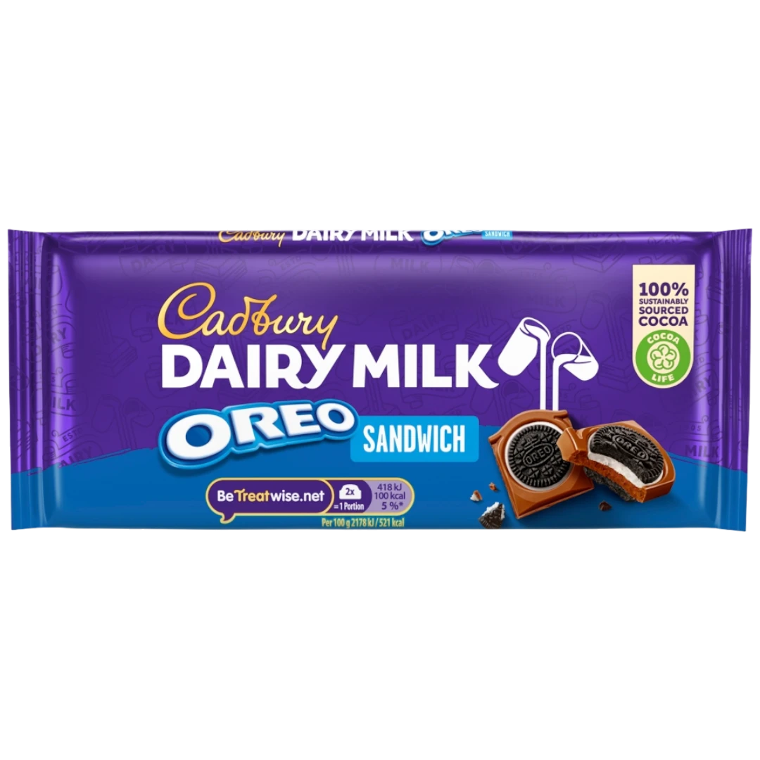 The Dairy Milk Oreo Sandwich Bar combines layers of delicious, smooth vanilla cream with a moreish Oreo biscuit centre, smothered in Cadbury’s Dairy Milk chocolate! A true taste sensation with every bite, you won’t be able to just have one.