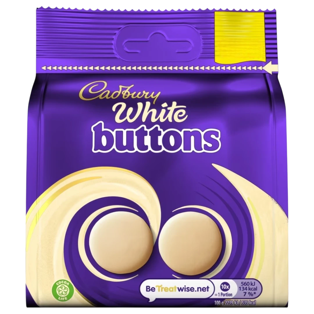 Indulge in the scrumptiousness of Cadbury White Chocolate Buttons – great for sharing and crafted with sustainable cocoa.