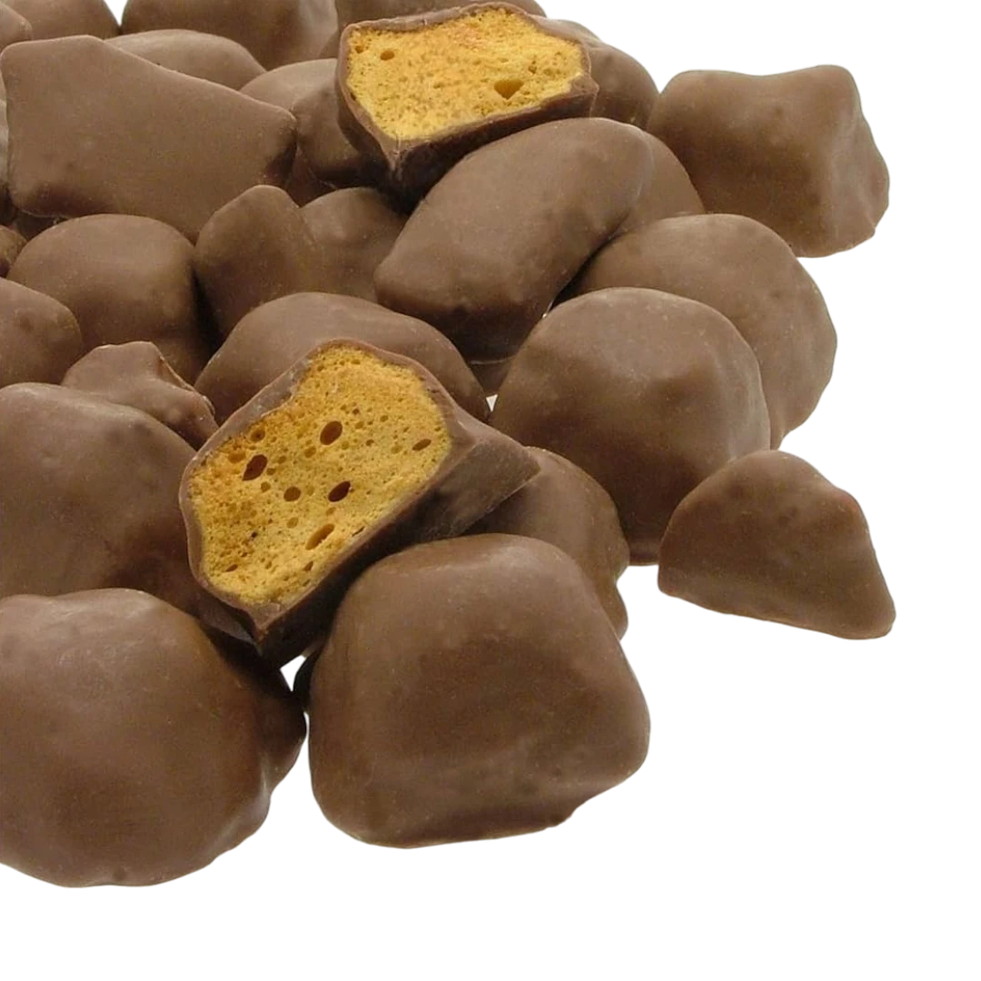Chocolate Covered Cinder Toffee is very hard to put down once started! The sweet and crunchy centre contrasts with the soft, creamy chocolate exterior to provide a delicious treat.