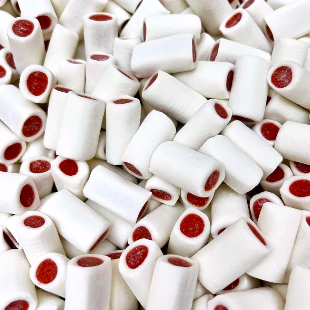 Delicious strawberry & cream flavoured pencil bites featuring a soft, fondant-like cream white outside and a sweet strawberry red flavoured liquorice inside!