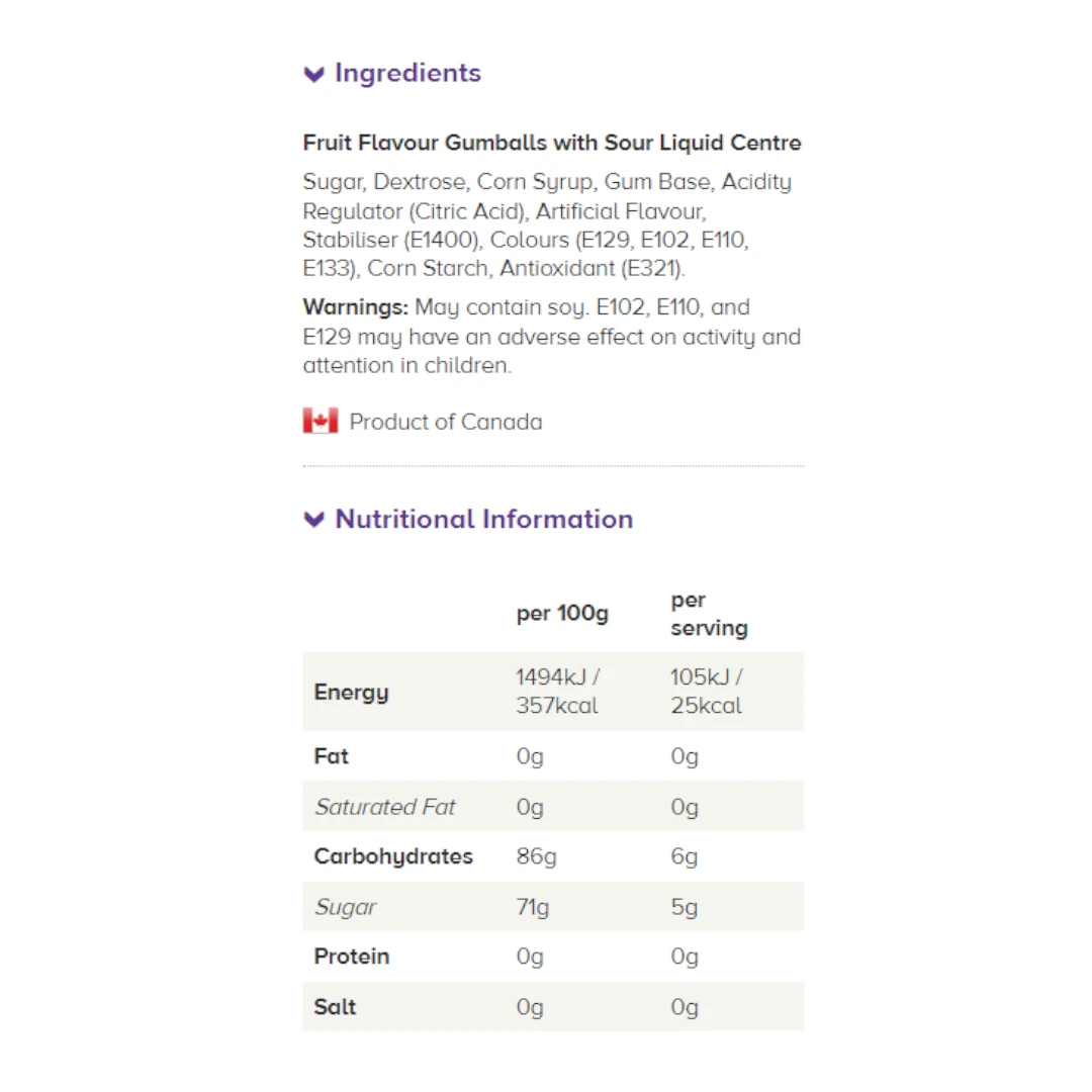 Sour gumballs with the assorted flavours of orange, lemon, blue raspberry, apple and cherry.