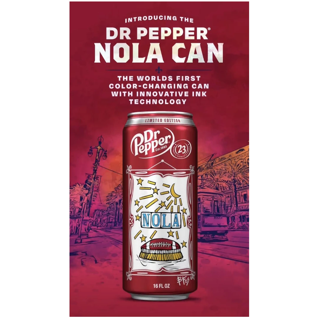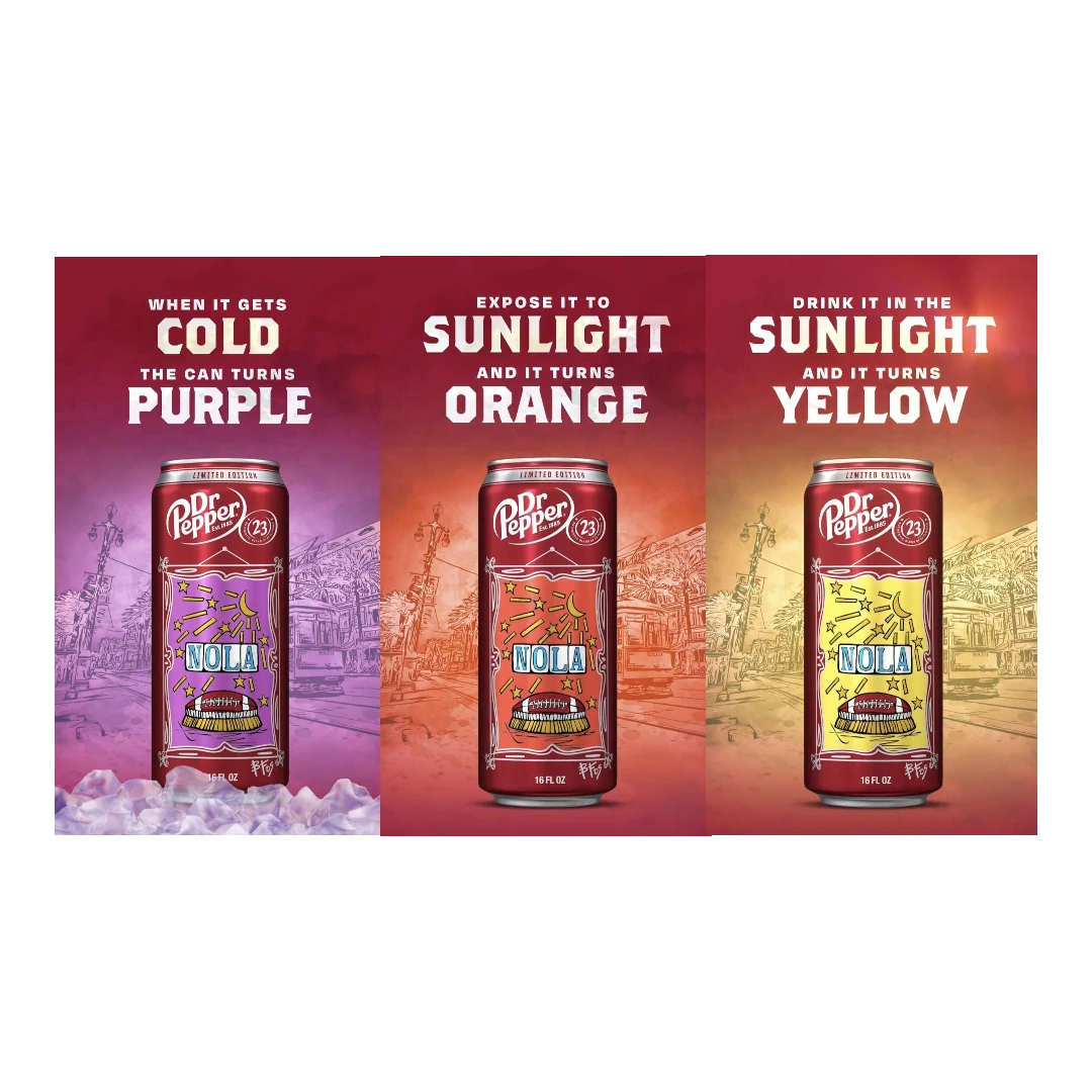 It’s official… the first ever, multi-colour-changing can has hit the streets and it’s sporting the New Orleans artist, Beck Fos’s, art! Dr Pepper and Becky have teamed up again to present this COLOURFUL COLLABORATION promising to bring a smile. They are the first brand in the world to leverage color-changing technology that allows the can graphics to change color four times, all dependent on temperature and sunlight! Make sure to grab one as these will only be available for a very limited time!