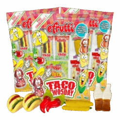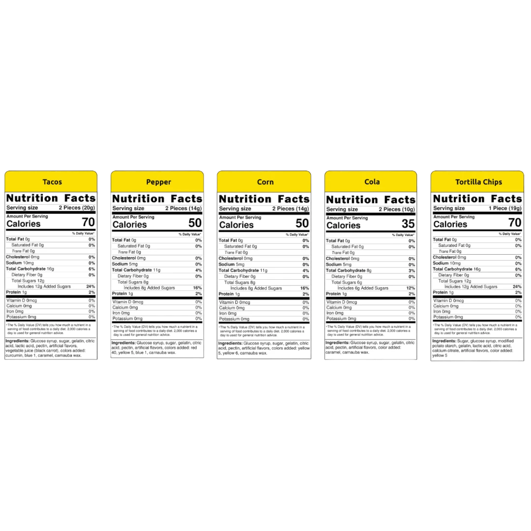 | corn cobs: glucose syrup, sugar, gelatin, E330, E440, salt, artificial flavors, colours added: E102, E110, E903. cola bottles: glucose syrup, sugar, gelatin, E330, E440, artificial flavors, colour added: caramel, E903. tacos: glucose syrup, sugar, gelatin, E330, E270, E440, artificial flavors, vegetable juice (black carrot), colours added: E100(i), E133, caramel, E903. peppers: glucose syrup, sugar, gelatin, E330, E440, artificial flavors, colours added: E129, E102, E133, E903. tortilla chips: sugar, glucose syrup, modified potato starch, gelatin, E270, E330, calcium citrate, artificial flavors, colour added: E102. ingredients and NUTritional information provided by manufacturer and considered accurate at time of posting. refer to product labeling or contact manufacturer directly for current data. |