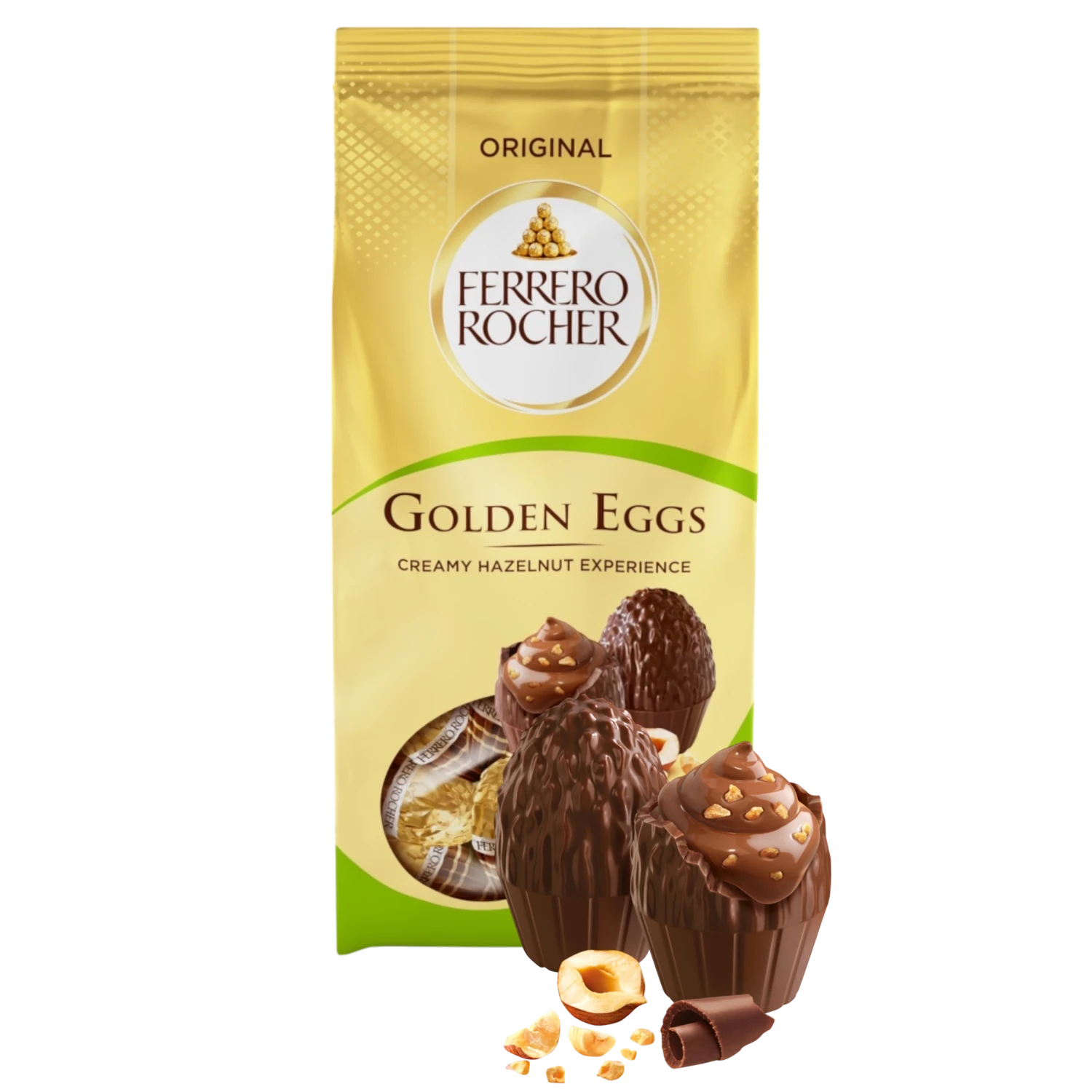 Get wrapped up with Ferrero Rocher. Ferrero Rocher Golden Eggs offer a unique taste experience. A luxurious creamy milk chocolate eggs with a hazelnut filling with hazelnut and crispy wafer pieces, surrounded by a milk chocolate shell, creating a unique Ferrero Rocher taste experience. Perfect for sharing, Easter Egg hunts, or a self-indulgent treat.