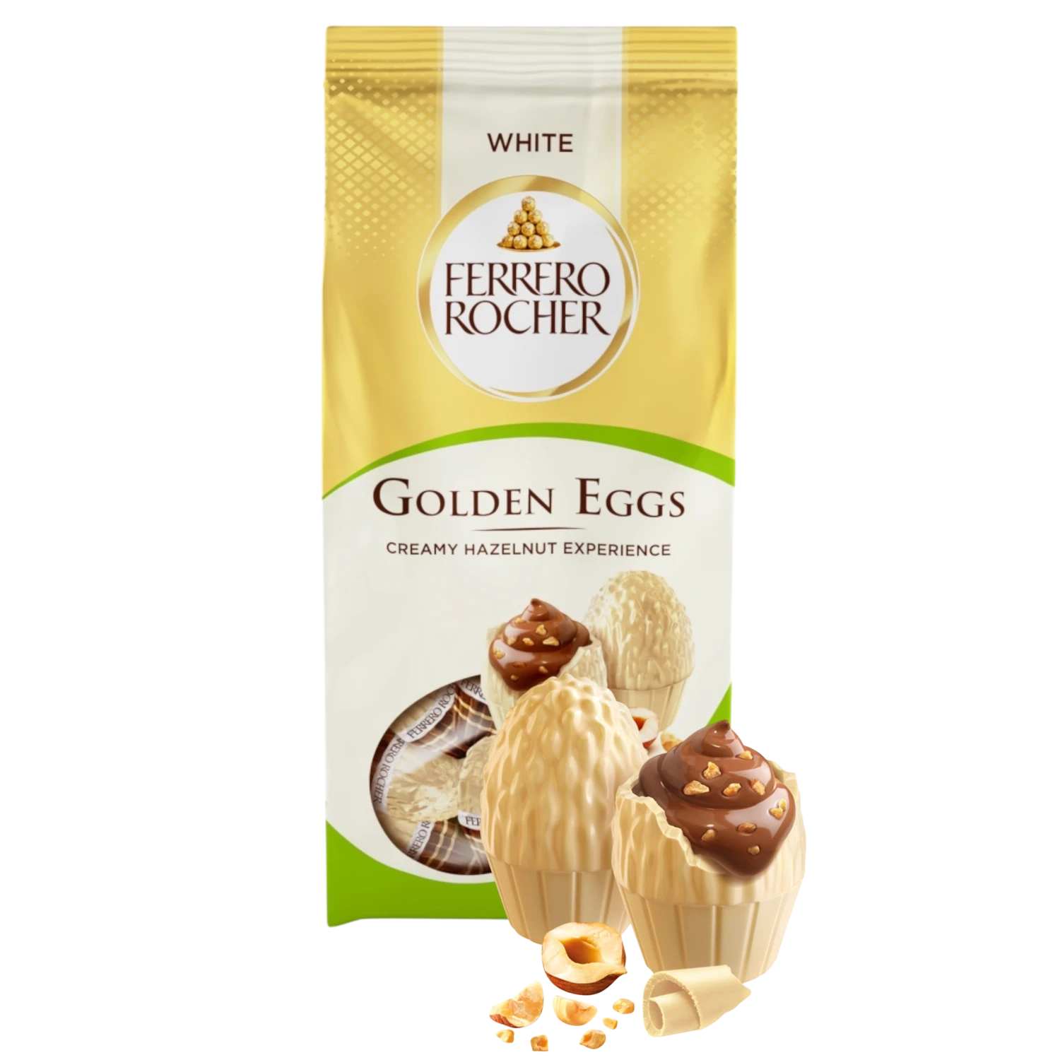 Get wrapped up with Ferrero Rocher. Ferrero Rocher White Golden Eggs offer a unique taste experience. A luxurious creamy white chocolate eggs with a hazelnut filling with hazelnut and crispy wafer pieces, surrounded by a milk chocolate shell, creating a unique Ferrero Rocher taste experience. Perfect for sharing, Easter Egg hunts, or a self-indulgent treat.