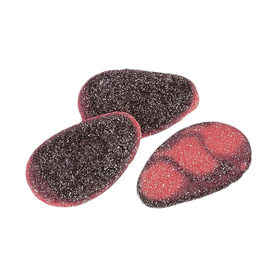 glucose syrup, sugar, gelatin, corn starch, humectant: glycerin; acidulant: citric acid, malic acid; gelling agent: pectins; flavourings, vegetable concentrate: radish, carrot, blackcurrant; colourings: E120, E153.