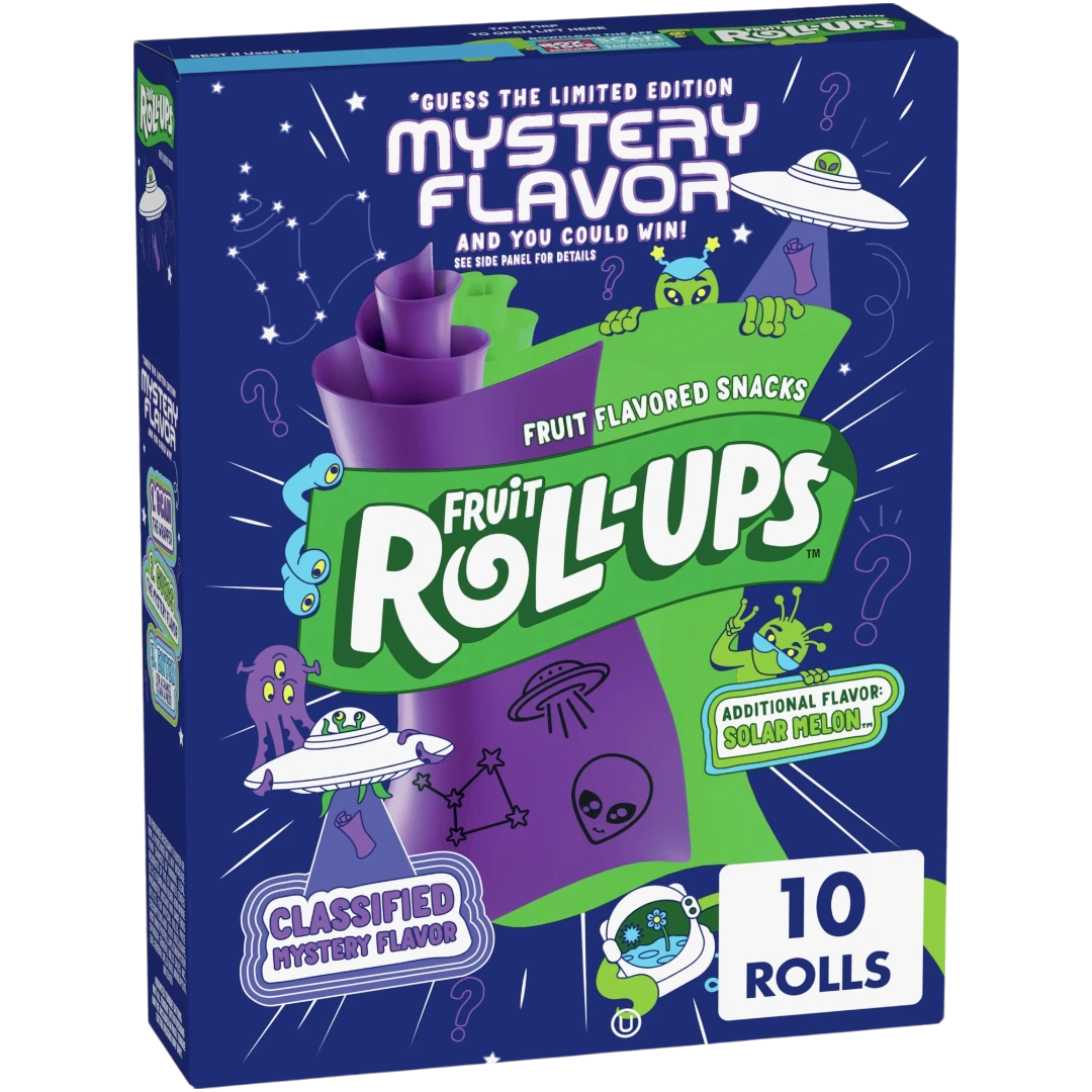 - FRUIT FLAVORED SNACKS: Unwrap delicious fun with Fruit Roll-Ups Mystery Flavor Fruit Flavored Snacks and additional flavor including Solar Melon; With wild flavors and colors, the possibilities for fun are endless