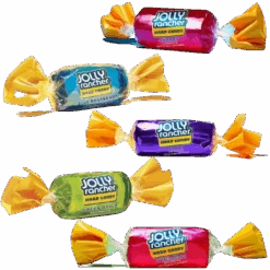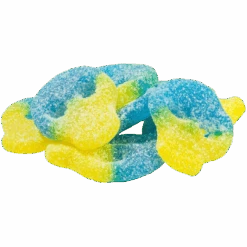 Sugar, glucose syrup, flavours, colours: E100, E120, E133; dextrose, acidifiers: citric acid, malic acid, thickener: magnesium stearate.