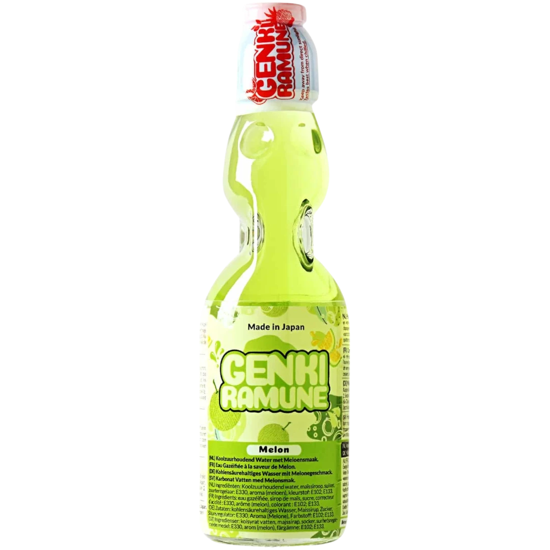 A delicious, sweet and refreshing glass bottle of melon ramune; the ideal summertime cool down! Part of the quintessential Japanese summer experience, these unique bottles come with a traditional glass marble stopper neck. To open the drink you must use the included plunger to “pop” the glass ball into the bottle. Then you are free to enjoy the fruity, bubbly goodness!