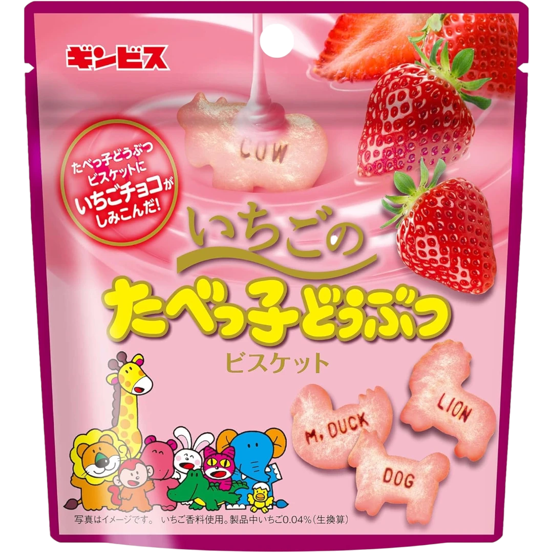 Get ready for a seriously delicious (and seriously adorable!) snack with these strawberry flavoured Ginbis Tabekko Animal Biscuits from Japan! ‘Tabekko Dobutsu’ is super popular in Japan and the term loosely translates to animal shaped biscuits – this edition has the name of the animals printed on the biscuit itself, and there are 12 animals to collect. See if you can find all of them!