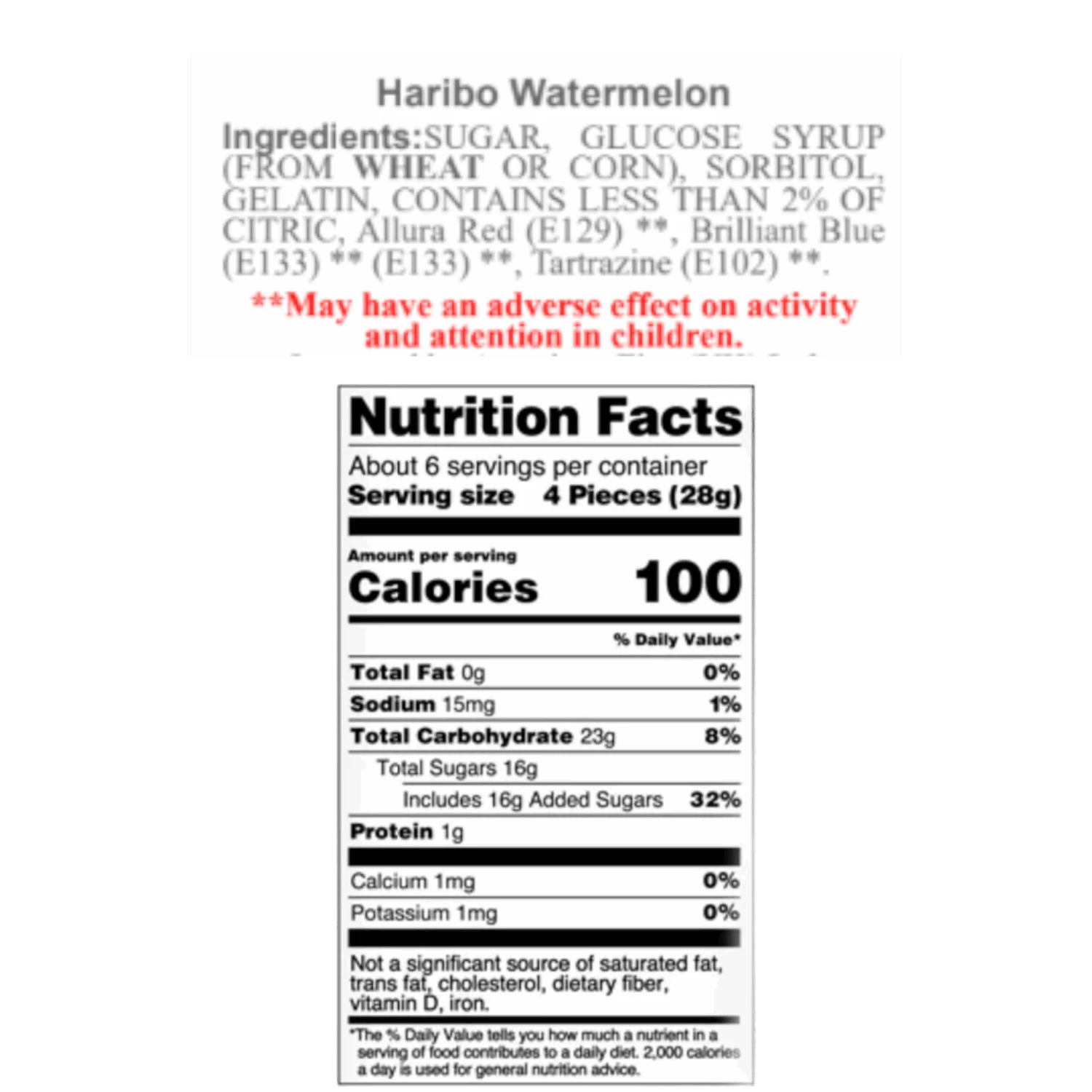 | sugar, glucose syrup (from WHEAT or corn), sorbitol, gelatin, contains less than 2% of: E330, E440, triE331, artificial flavors, E129, E133, E102. may contain: WHEAT, traces of MILK.