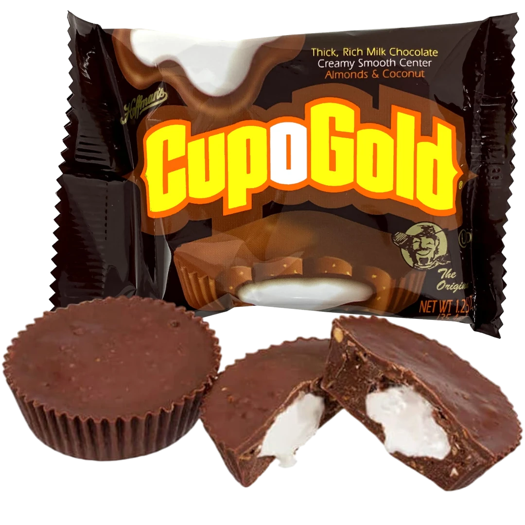The Cup-O-Gold candy bar was designed to provide a luxurious and indulgent candy experience. featuring a cup-shaped milk chocolate shell filled with a combination of marshmallow, roasted almonds, and coconut flakes. The combination of these flavors and textures made the Cup-O-Gold candy bar stand out from other candy bars!