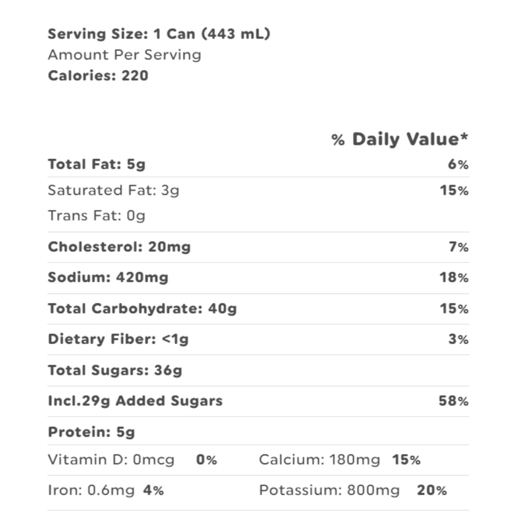 | coffee (filtered water, coffee), skim MILK, cane sugar, cream (MILK), pectin, cocoa (processed with alkali), salt, natural and artificial flavors. Produced in a facility that also processes tree NUTs and SOY. |