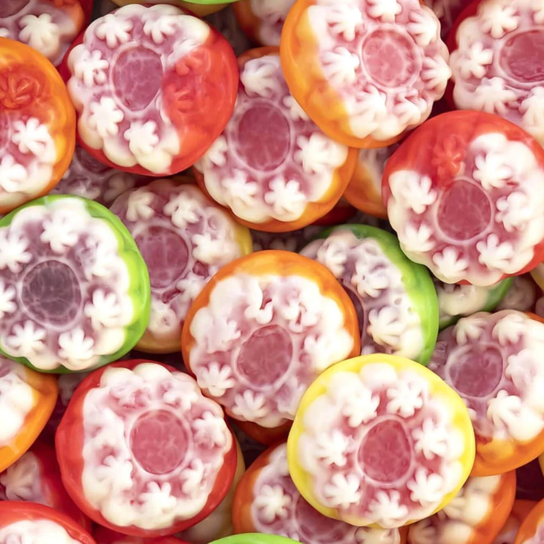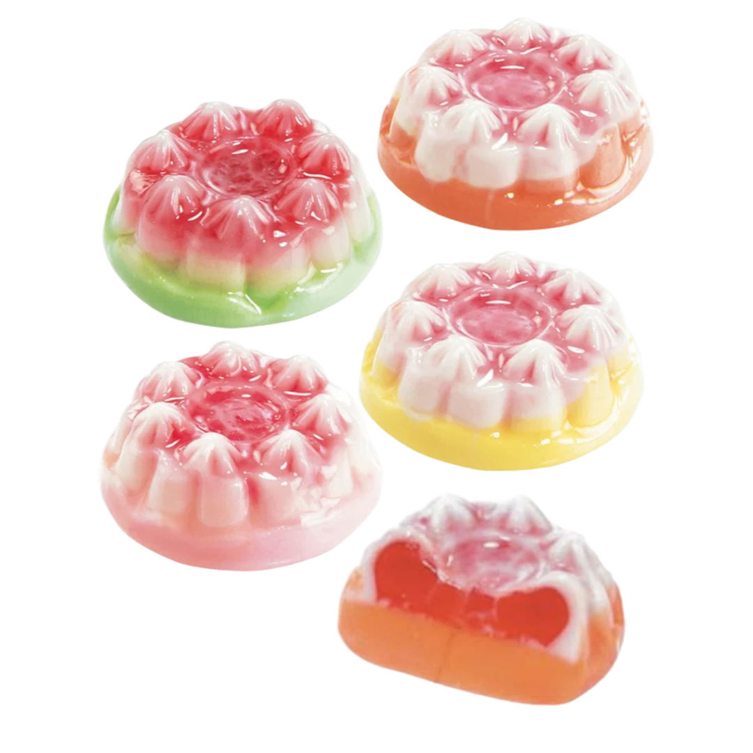 Yummy strawberry, banana & raspberry flavoured cake-shaped gummies filled with a squishy jelly centre!