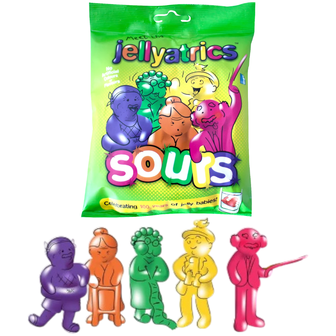There’s still plenty of life left in our Jellyatrics and they’re not prepared to put their feet up just yet! In fact they’ve now turned sour, making sure their presence is known! To keep up with the kids, the Jellyatrics have donned their sour sugary overcoats to latch onto the demand for sour sweets! They still boast the same distinctive fruity flavours and original shapes but are now dusted in a sour sugary coating.