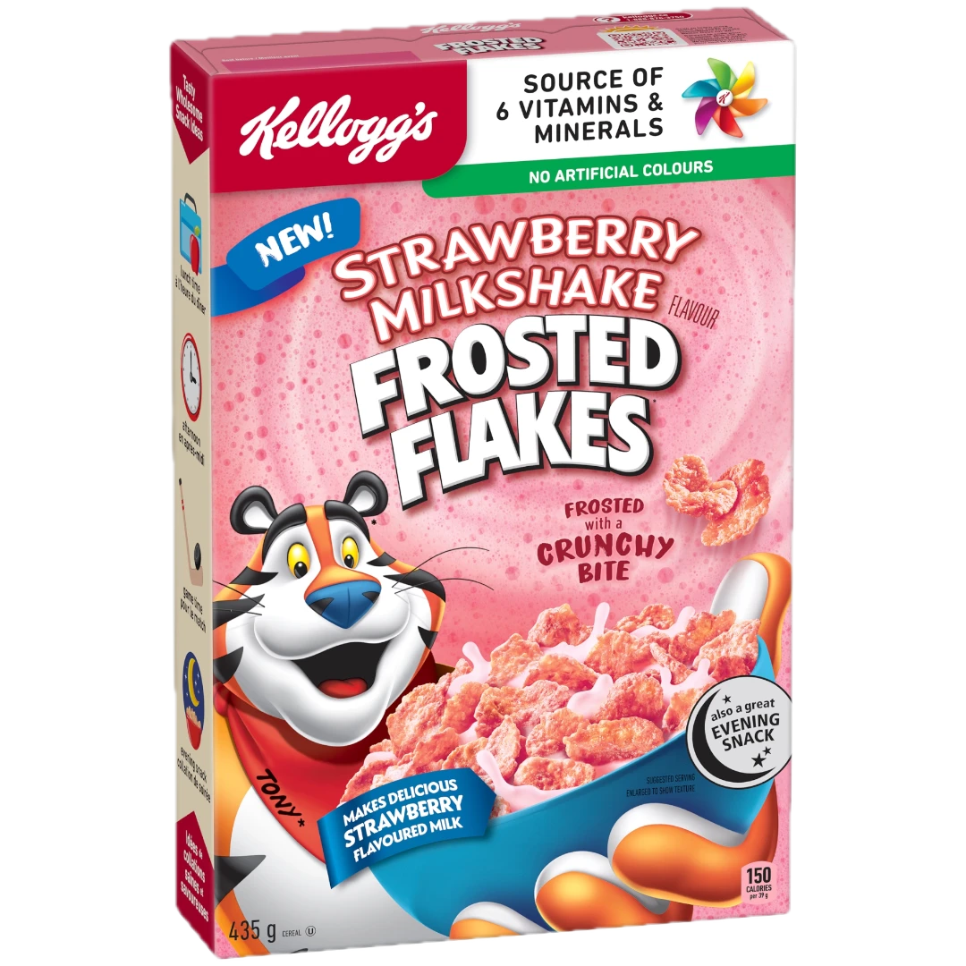 A deliciously sweet combination of the irresistible crunch of Kellogg’s Frosted Flakes* cereal with ripe, juicy strawberry milkshake flavour coupled with rich, creamy notes, this cereal turns the milk in your bowl a fun pink!