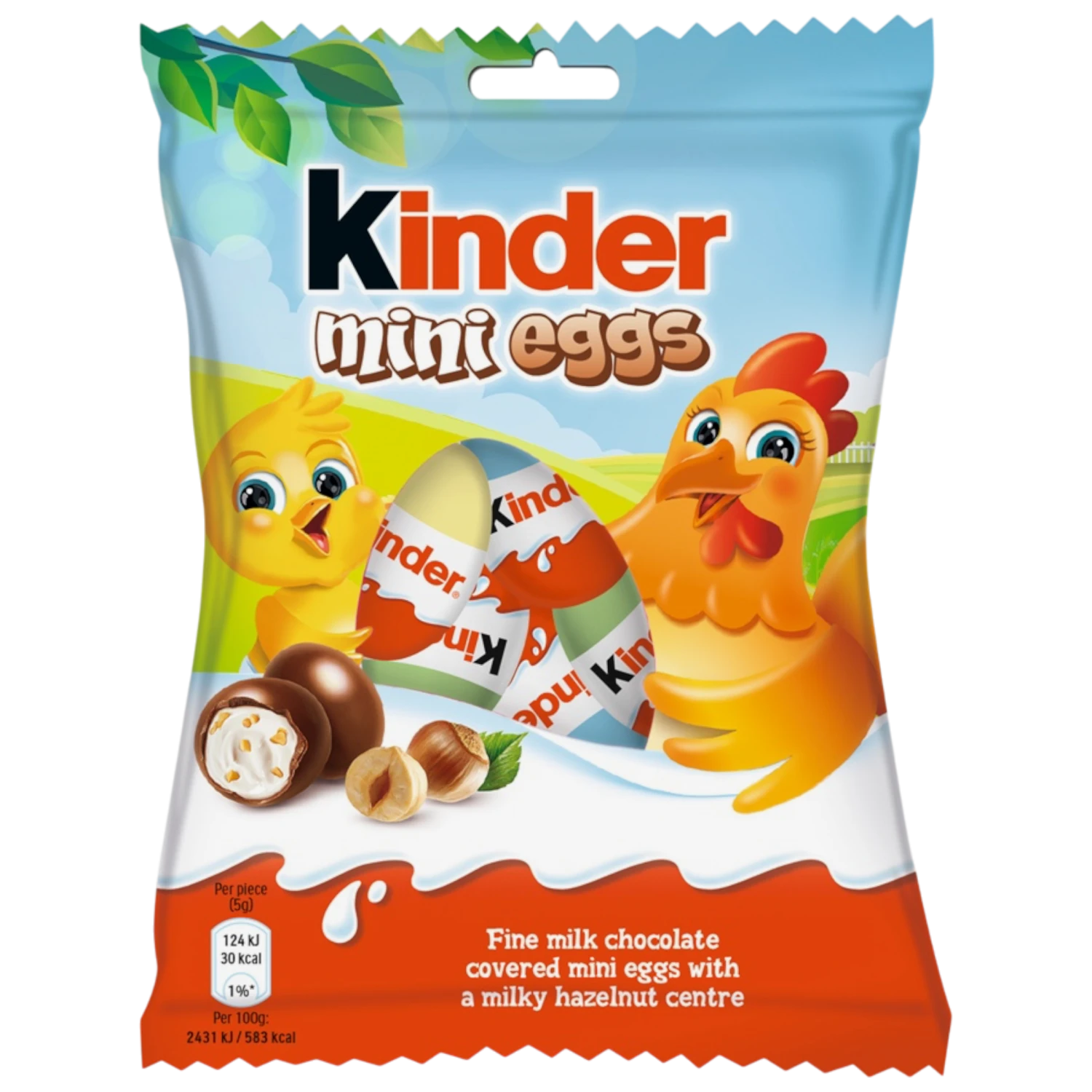 Delicious milk chocolate mini eggs with a milky hazelnut centre. Individually wrapped, these Kinder Mini Eggs are perfect as a little treat or to use in an Easter egg hunt.