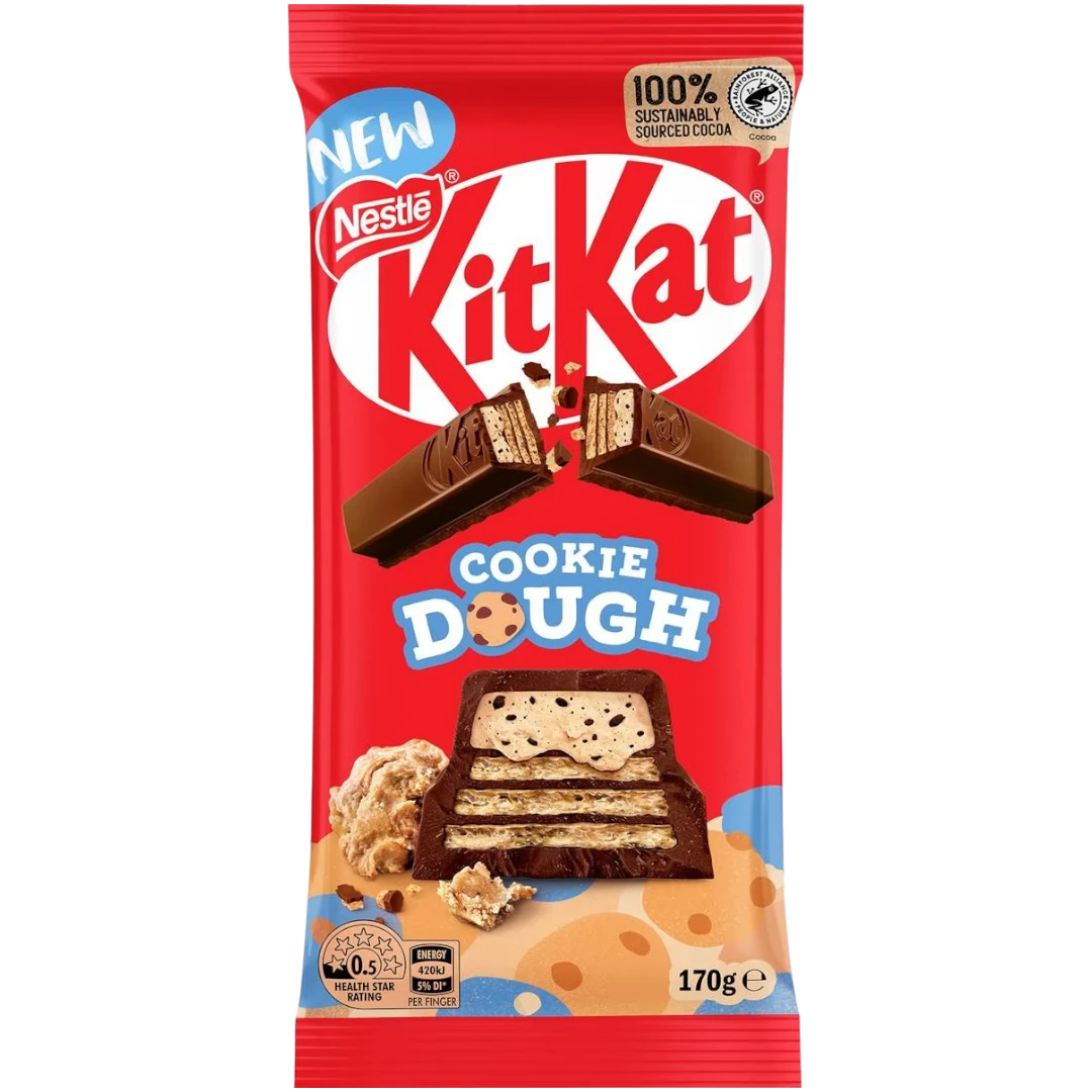 Fill your break with Cookie Dough & extra chocolate with this Aussie-exclusive XL KitKat block! Crisp oven baked wafers topped with delicious cookie dough filling, all covered in deliciously smooth milk chocolate!