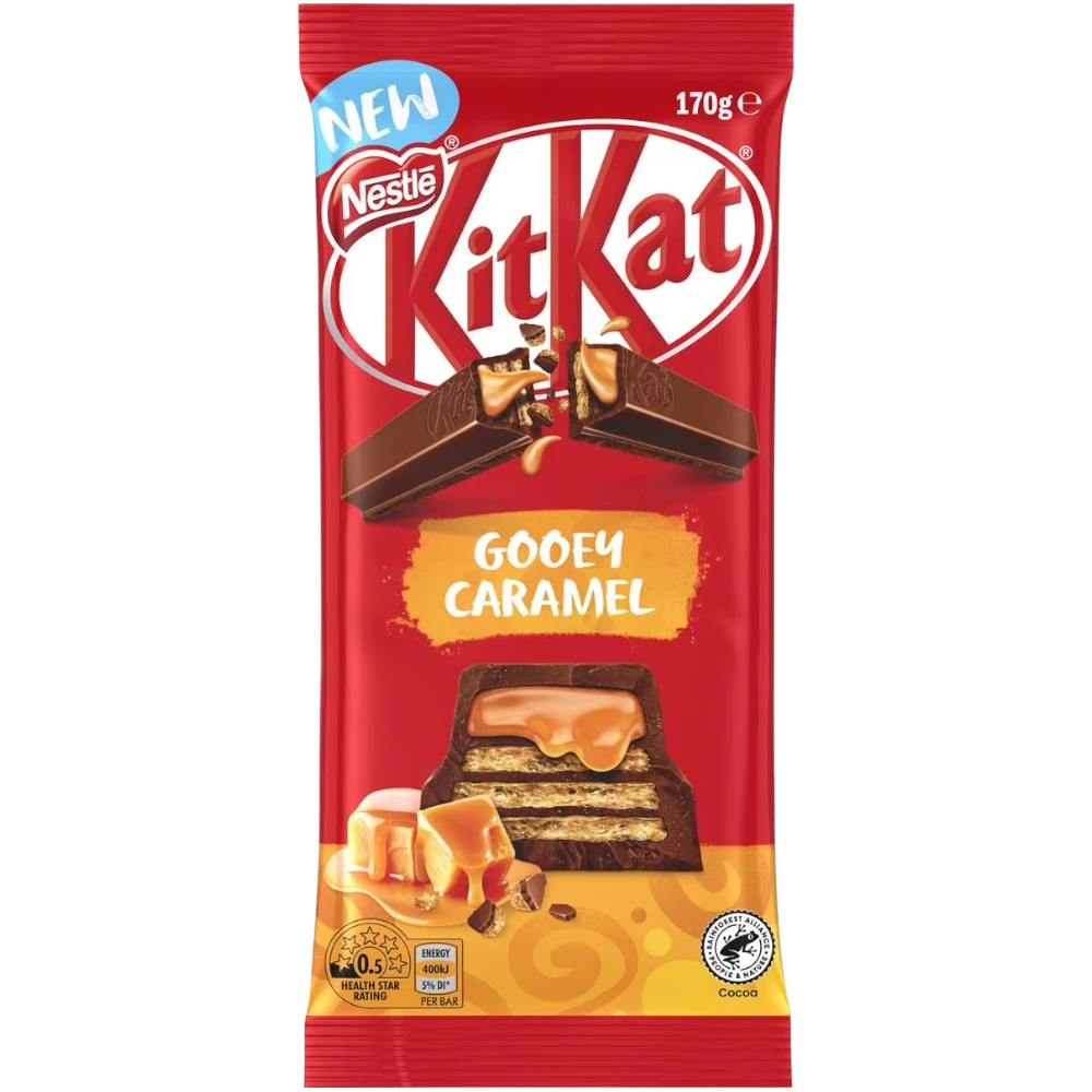 BIG cravings deserve BIG flavour so take a BIG bite into the delicious Aussie exclusive KitKat Chunky Gooey Caramel block. This bar has the iconic crisp oven baked wafer finger, layered with decadent flowing caramel covered in thick milk chocolate, made from 100% certified sustainable cocoa, supplied through the Nestlé Cocoa Plan. Just unwrap, break off one chunk and savour the deliciously smooth and gooery caramel and milk chocolate combination. Have a break, have a KitKat®.