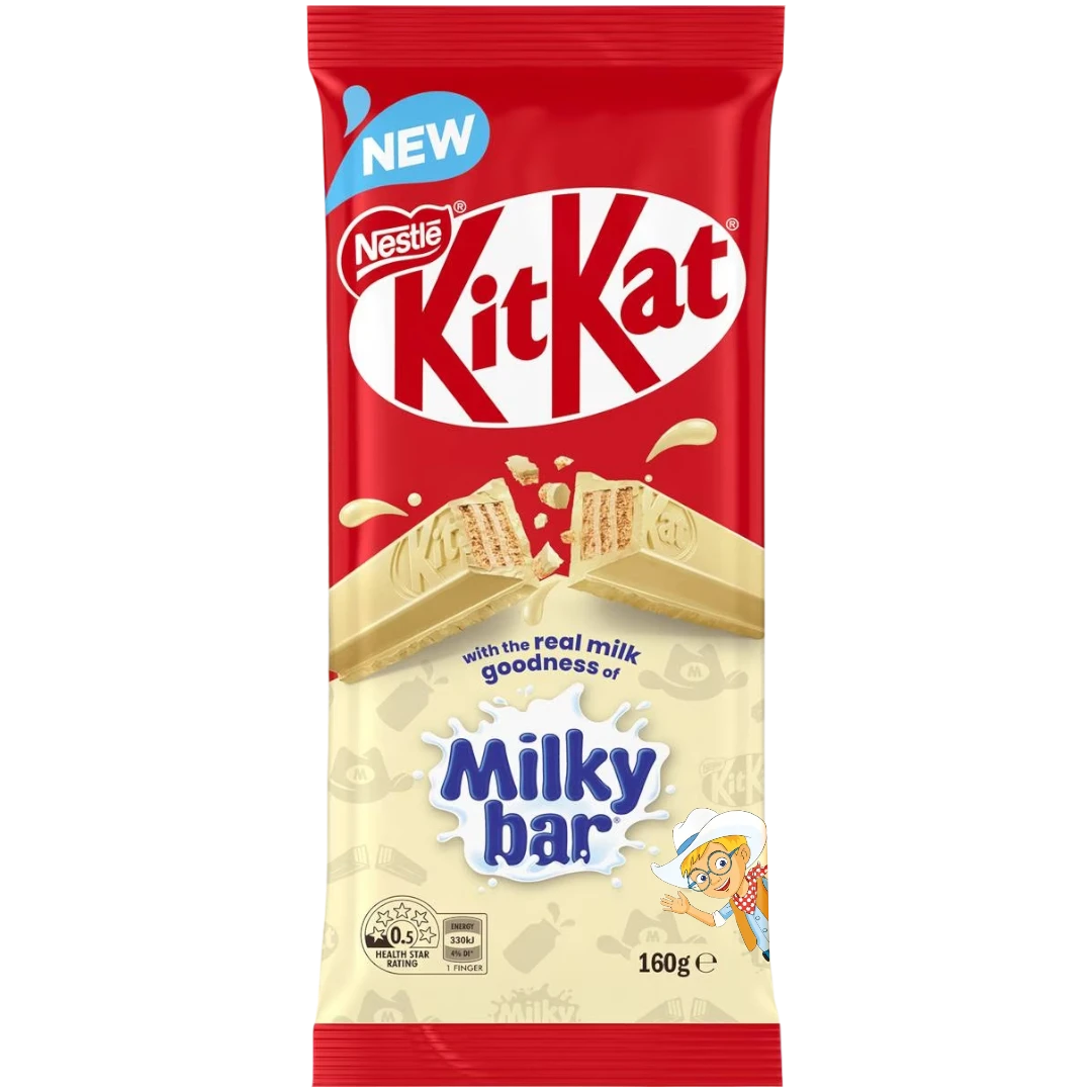 When two chocolatey worlds collide! Break into this KitKat with Milkybar to discover a different way to break. This 160g block is made of 11 rows of crisp oven baked wafer fingers smothered in MILKYBAR white choc… The perfect balance of smooth and creamy Milkybar white choc and crispy KITKAT wafer you know and love!