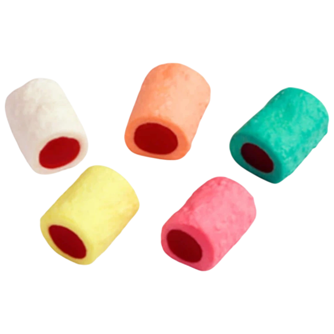 Barrel-shaped colourful fondant in a variety of delicious fruity flavours wrapped around a scrumptious strawberry liquorice centre!