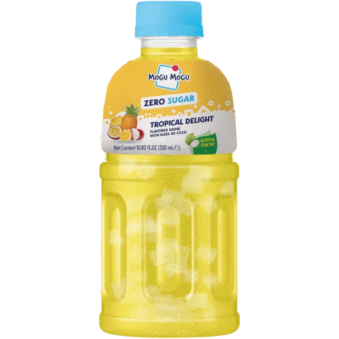 Zero Sugar, All Flavour. Introducing the brand new ZERO SUGAR Mogu Mogu range! Mogu Mogu Tropical Delight is tropical and refreshing. This drink contains chewy pieces of Nata de coco also known as coconut jelly!