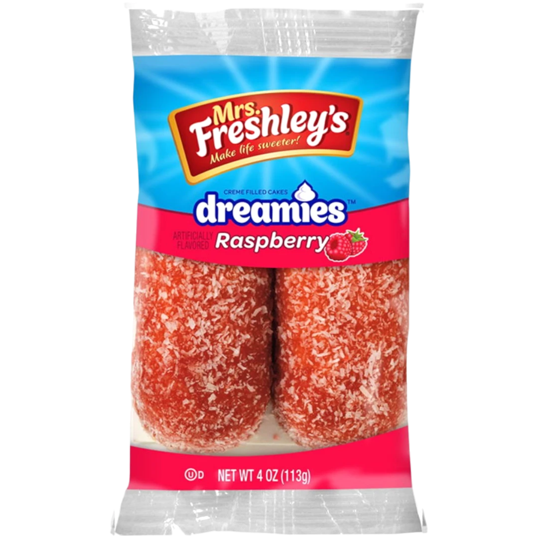 Mrs Freshley’s Dreamies are sweet, sticky little cakes that are packed full of rich & delicious creme… and this variety is coated in sweet raspberry and coconut!