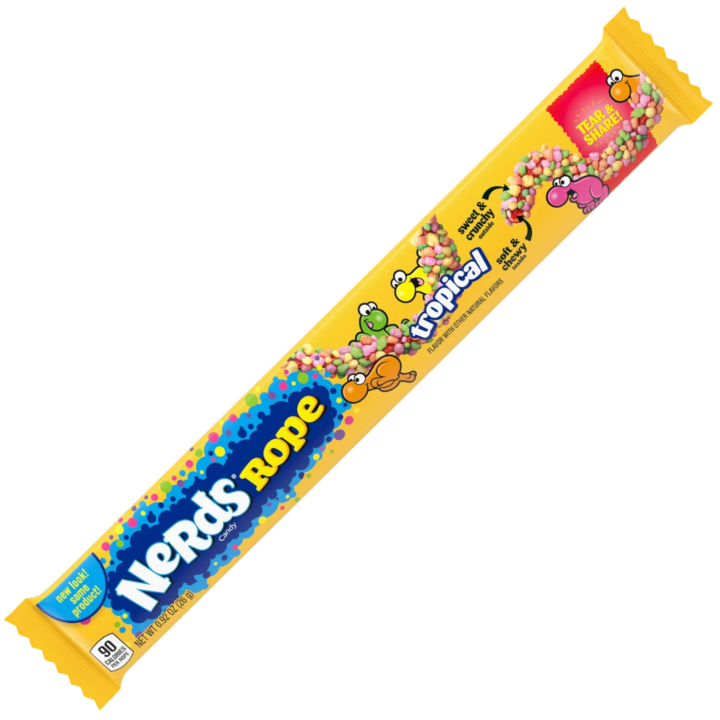 With its sense-bending contrast of gummy and crunchy, NERDS Rope is a zany, color, texture and taste combination best defined as a candy celebration.As cool and as colorful as far island birds. It’s sweet and it’s chewy and crunchy, to boot. They’re basically extremely long Nerds Gummy Clusters!