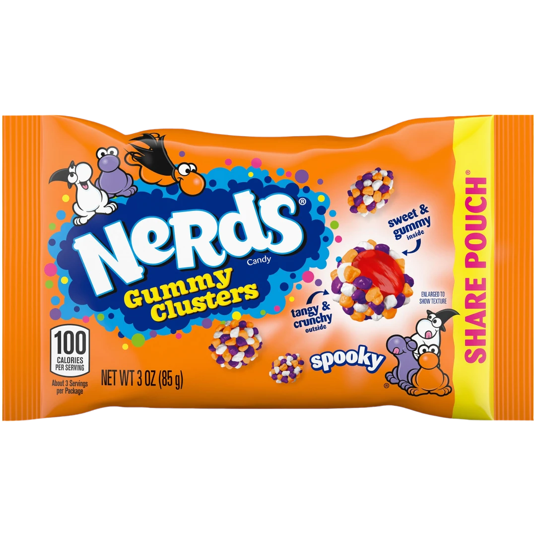 Get into the spirit of Halloween with this seasonal edition of Nerds Gummy Clusters! These spooky candies will have you screaming with delight, as you enjoy the nuggets of tiny, zingy candy on the outside, before chewing into the soft taffy rope on the inside – all in cool Halloween colours!
