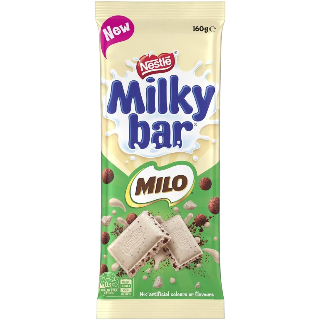 Enjoy this delicious combo of creamy Milkybar with Milo powder and crispy choc-malt balls! We love milk! That’s why Milkybar is made with real milk goodness. Milkybar’s smooth & creamy recipe has no artificial colours or flavours.