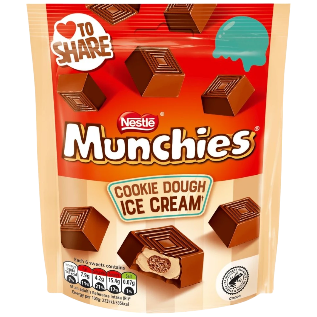 Discover the new MUNCHIES® Cookie Dough Ice Cream sharing bag, smooth milk chocolate cubes encasing a delicious cookie dough flavour filling & crunchy biscuit centre, making them the ideal treat to share with family and friends.