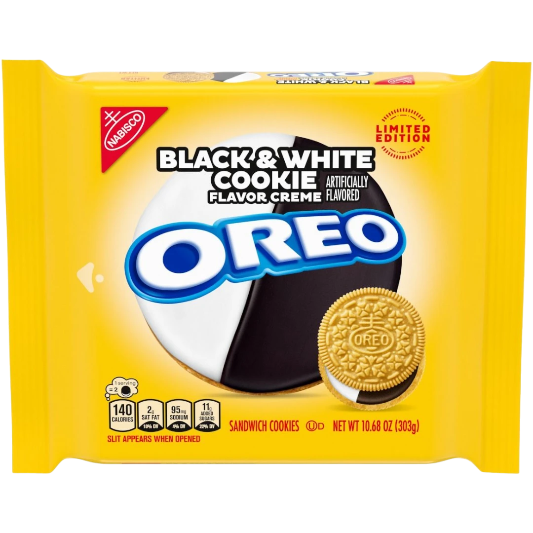 Enjoy two delicious cookies in one with OREO Black and White Cookie Creme Sandwich Cookies. These limited edition OREO cookies feature two Golden OREO vanilla wafers filled with side-by-side dark chocolate cake flavored creme and white cake flavored creme!
