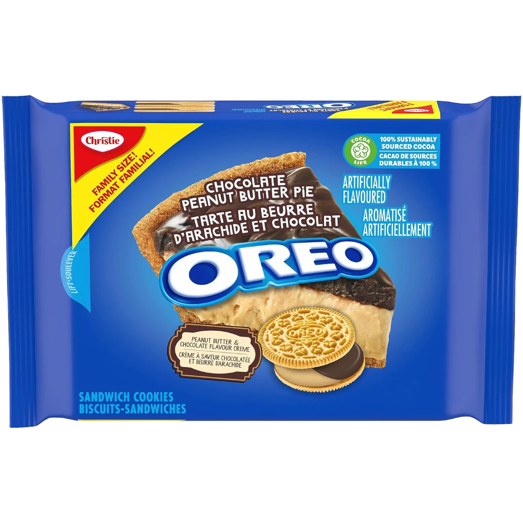 Cookie of Comfort Kick back with the feel-good flavor of OREO Chocolate Peanut Butter Pie Sandwich Cookies. Chocolate and peanut butter creme–flavored filling and graham-flavored wafers make for a melt-in-your-mouth snack experience that’s only as far away as the cookie jar!