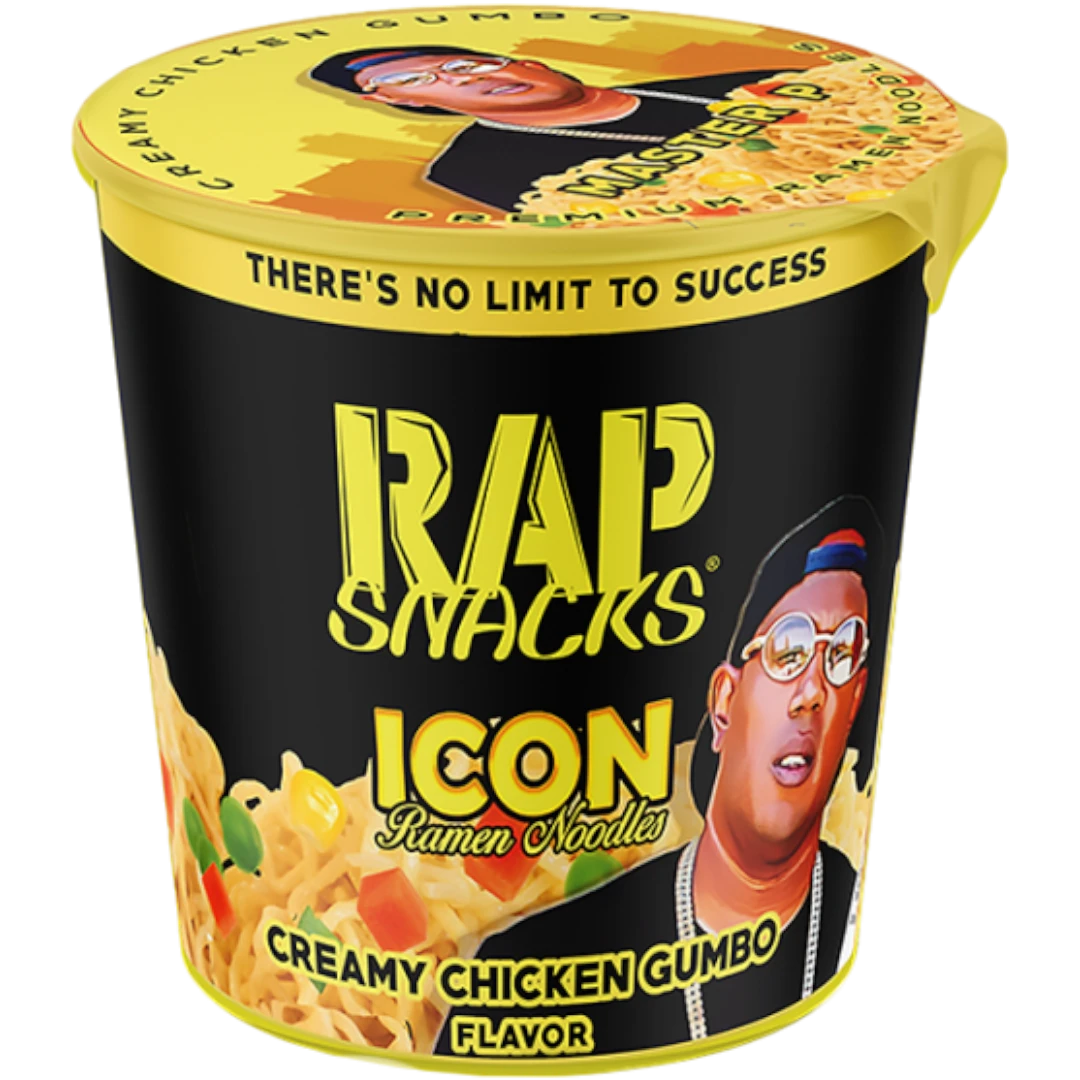 Rap Snacks Icon Creamy Chicken Gumbo Ramen Noodles, inspired by Master P, merges the soulful essence of traditional Southern cooking with the convenience of instant noodles, creating a unique culinary experience!