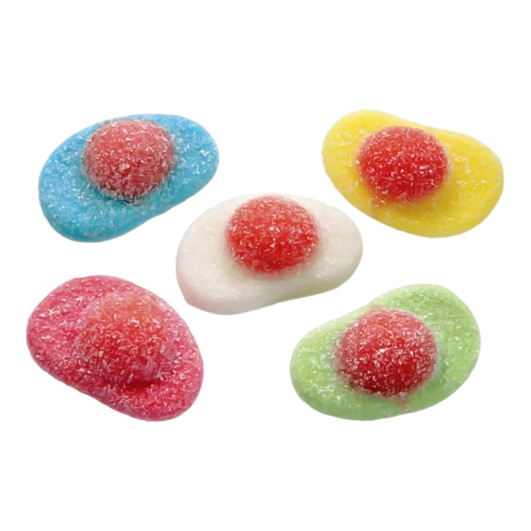 Fried egg gummy sweets with a sparkling sour topping. Strawberry, lemon, orange, apple, pineapple and raspberry flavours., so many to choose from!